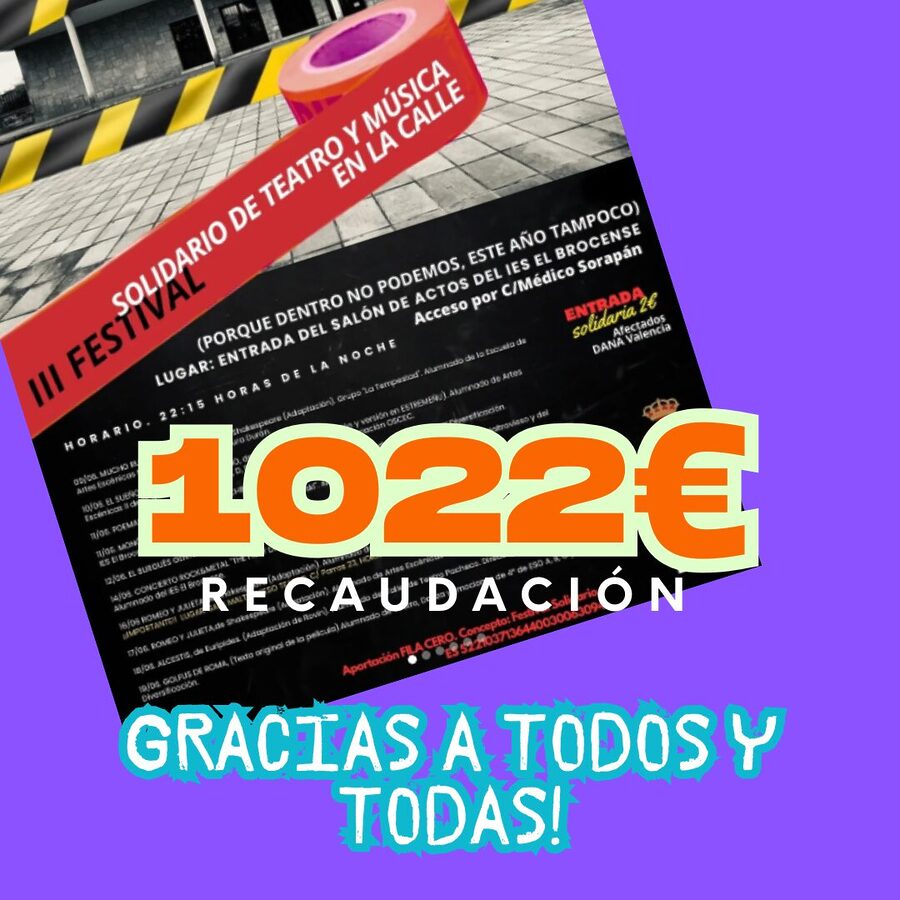 Os damos infinitas gracias por vuestra asistencia al festival y por vuestras aportaciones. Hemos recaudado un total de 1.022€, estamos gestionando la mejor forma de donación. Informaremos por este medio del destino del dinero. De nuevo, muchas gracias!